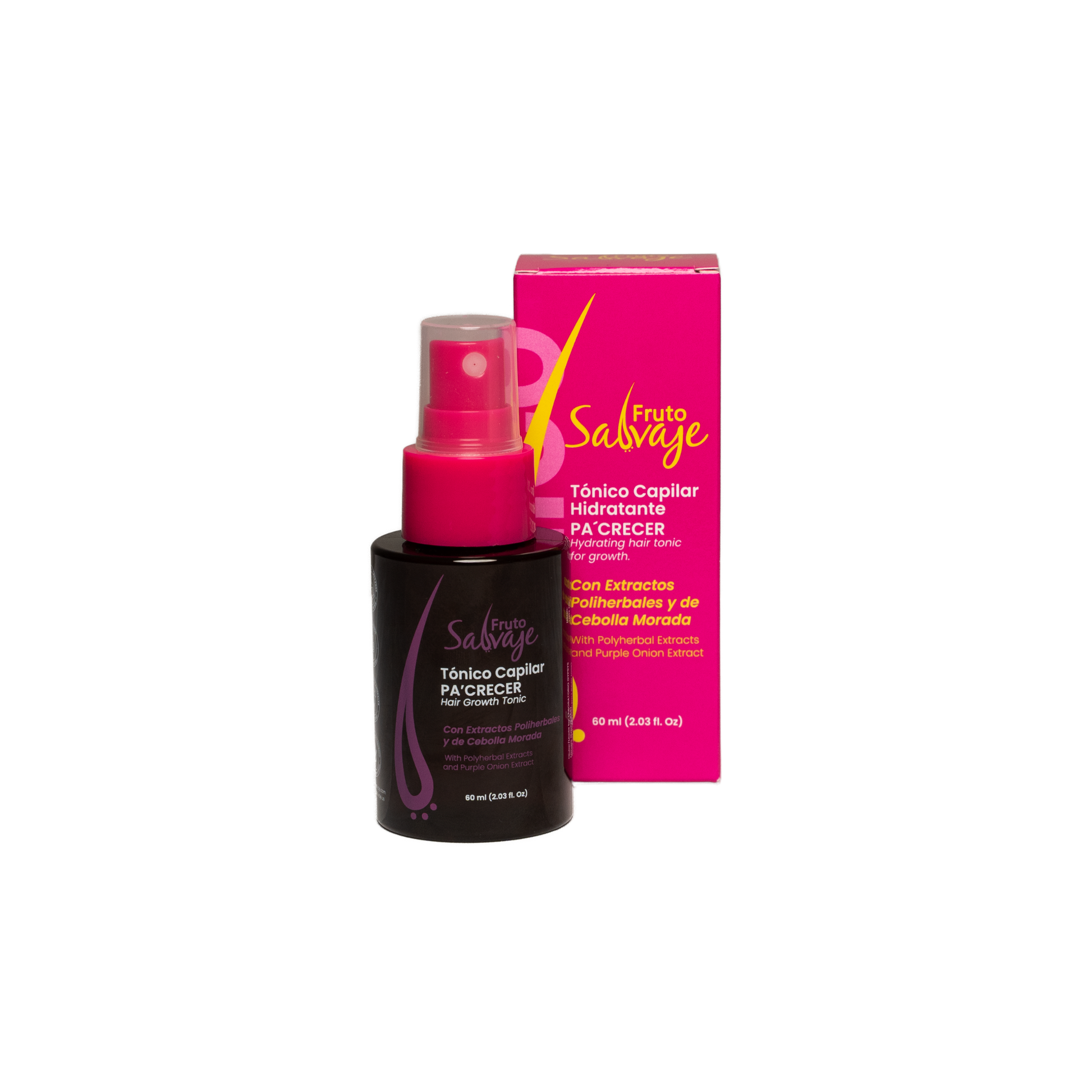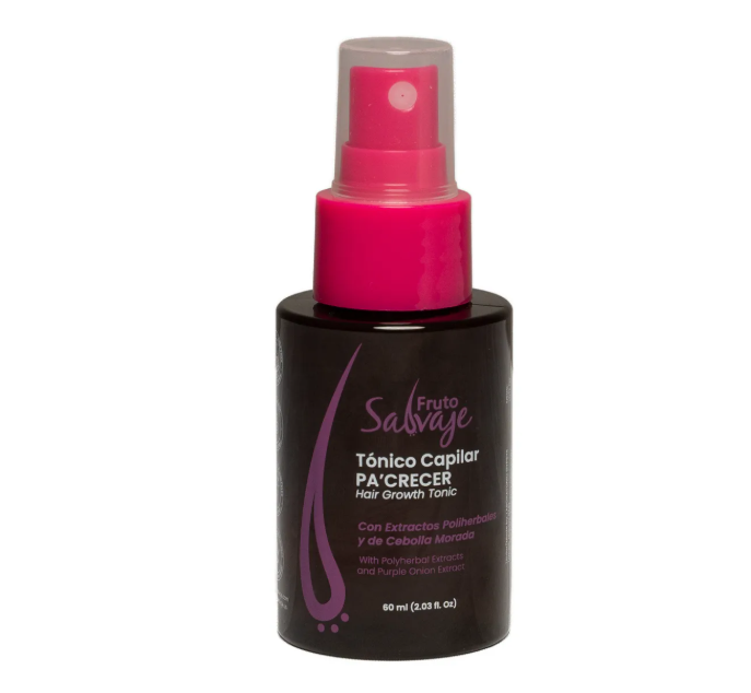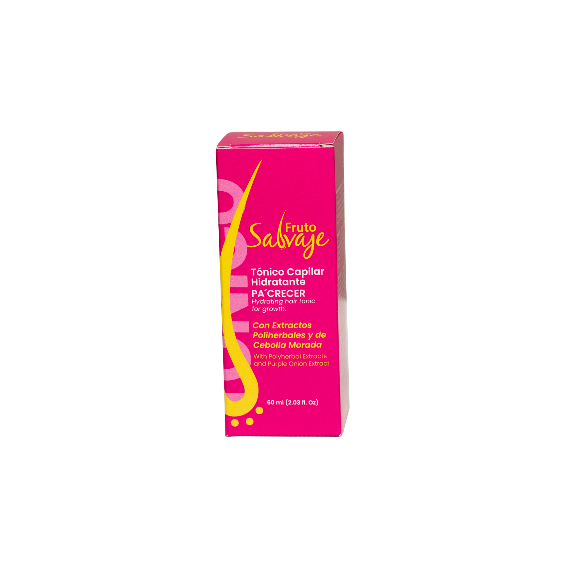 Tónico Capilar Crecimiento Fruto Salvaje, activa la papila dérmica estimulando el crecimiento de las hebras capilares, dando energía a las células del folículo y el bulbo capilar; fertiliza toda la hebra desde de la raíz hasta la punta para que crezca.